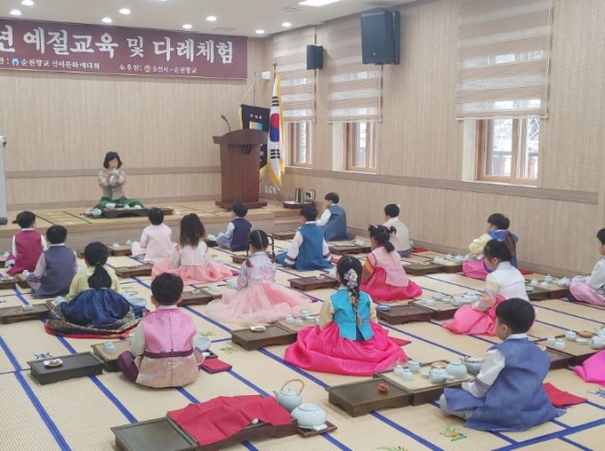 순천향교 명륜당에서 한복 바르게 입기와 생활 예절을 익히는 것을 시작으로, 선비문화체험학습관에서 다례·다식 체험과 윷놀이를 즐기며 우리 전통의 가치와 올바른 인성을 배우는 시간을 갖는다.