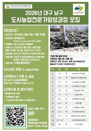 [ 중앙뉴스미디어 ] 대구 남구는 도시농업에 대한 전문적인 지식을 전달하고 현장 실무 역량을 갖춘 인력을 양성하기 위해 ‘2026년 도시농업전문가 양성과정’ 수강생을 모집한다고 밝혔다. 이번 과정은 도심 속 농업의 가치를 확산시키고 구민들에게 새로운 직업 역량 강화 및 사회 참여의 기회를 제공하기 위해 기획됐다.