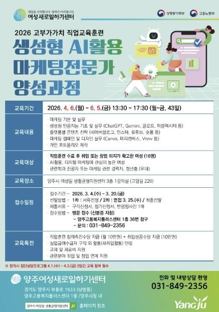 [ 중앙뉴스미디어 ] 양주여성새로일하기센터에서는 오는 3월 4일부터 20일까지 직업교육훈련 과정인 ‘생성형 인공지능(AI)활용 마케팅전문가 양성과정' 교육생을 모집한다.