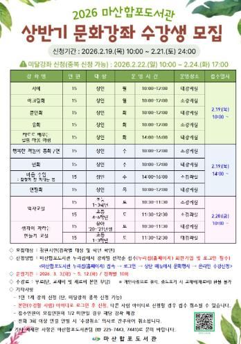 [ 중앙뉴스미디어 ] 창원특례시 마산합포도서관에서는 시민들에게 다양한 평생학습 기회를 제공하고자 ‘2026년 상반기 문화강좌’ 수강생을 2월 19일부터 2월 24일까지 마산합포도서관 누리집에서 온라인(선착순)으로 모집한다.