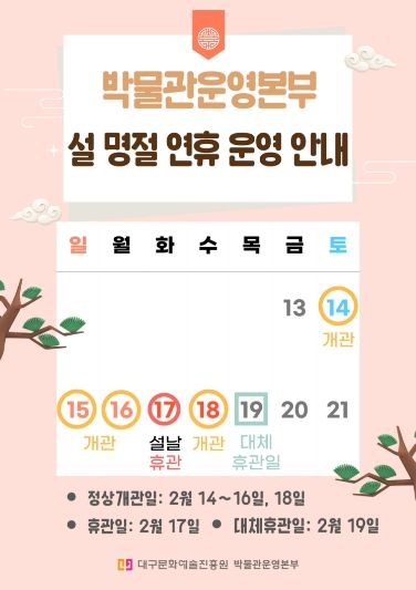 한편, 대구시립 3개 박물관은 설 연휴 다음날인 2월 19일(대체휴관일)에는 하루 쉰다.