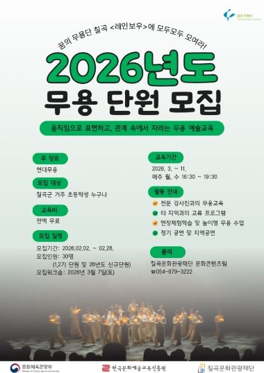 [ 중앙뉴스미디어 ] (재)칠곡문화관광재단(이사장 김재욱)은 2025 꿈의 무용단, ‘칠곡’ '레인보우' 단원을 모집한다.