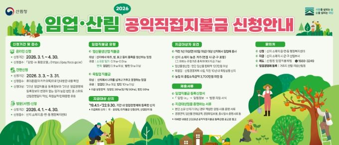 임업직불금 신청은 온라인·방문 신청 등 다양한 방식으로 가능하다. 온라인 신청은 2026년 3월 1일부터 4월 30일까지 임업-in 을 통해 가능하며 방문 신청은 2026년 4월 1일부터 30일까지 산지 소재지 읍·면 행정복지센터에서 접수할 수 있다.