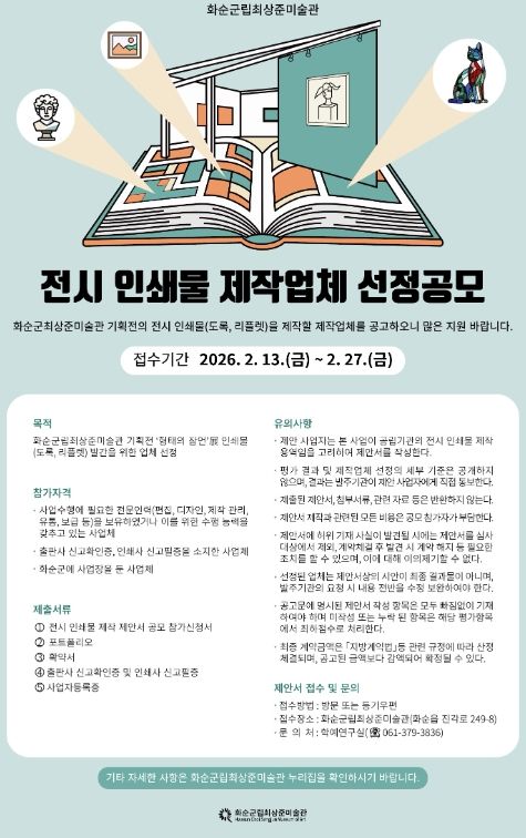 [ 중앙뉴스미디어 ] 화순군은 12일 화순군립최상준미술관 기획전 ‘형태의 잠언’ 展 전시 인쇄물(도록, 리플릿) 제작을 전문적으로 수행할 업체를 공개 모집한다고 밝혔다.