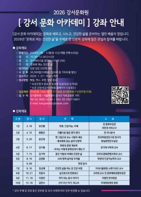 [ 중앙뉴스미디어 ] 서울 강서구 강서문화원(원장 김진호)은 오는 3월부터 12월까지 주민들의 인문학적 역량을 키우고 건강한 삶을 위한 ‘2026 강서 문화 아카데미’를 개최한다고 밝혔다.