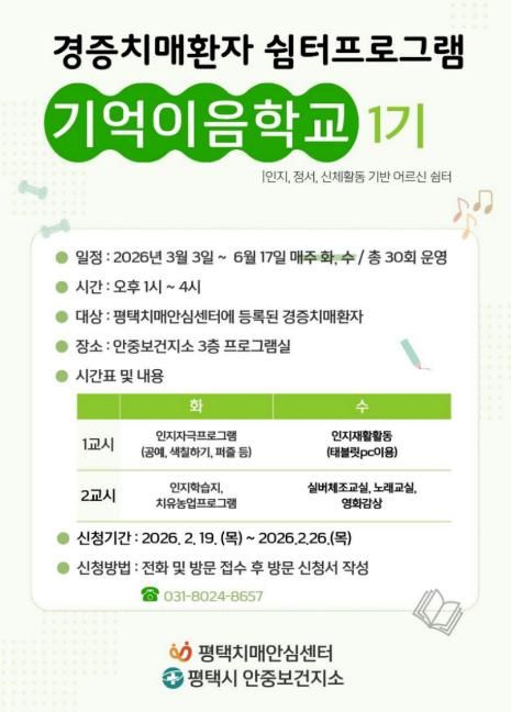 [ 중앙뉴스미디어 ] 평택시 안중보건지소는 경증 치매 환자의 인지기능 유지와 일상생활 지원을 위해 오는 3월 3일부터 6월 17일까지 경증 치매 환자 쉼터 프로그램 ‘기억이음학교 1기’를 운영한다.