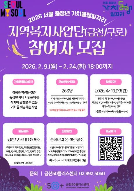 [ 중앙뉴스미디어 ] 금천구는 금천50플러스센터에서 경험과 역량을 갖춘 중장년 세대들에게 지속적인 사회참여를 지원하기 위해 ‘2026년 서울 중장년 가치동행일자리사업’ 참여자를 모집한다고 밝혔다.