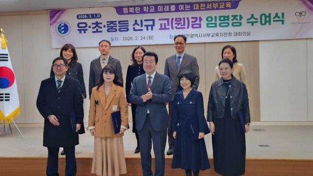[ 중앙뉴스미디어 ] 대전동부교육지원청과 대전서부교육지원청은 2월 24일, 오는 2026년 3월 1일자 인사발령에 따라 승진 및 전직 임용되는 유·초·중등 신규 교(원)감 임명장 및 인사발령통지서 수여식을 개최했다고 밝혔다.