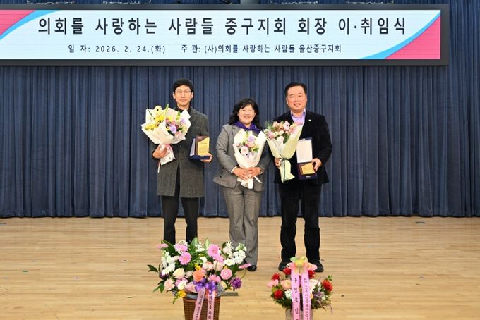 (사)의회를사랑하는사람들 울산중구지회는 24일 중구청 대회의실에서 열린 회장 이취임식 행사에 앞서 의정활동에서 모범을 보인 우수의원으로 선정된 김도운·안영호 의원에게 표창패를 전달했다.