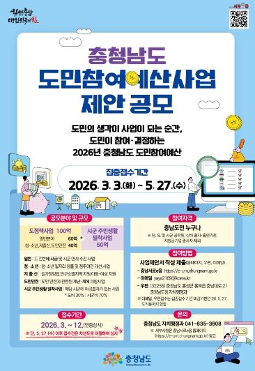 [ 중앙뉴스미디어 ] 충남도는 3월 3일부터 5월 27일까지 2027년 예산안에 반영할 ‘도민참여예산 제안사업’ 집중 접수기간을 운영한다고 26일 밝혔다.