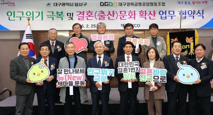 [ 중앙뉴스미디어 ] 대구 달서구는 25일 EXCO에서 대구경북금형공업협동조합(이사장 박만희)과 인구위기 극복 및 결혼·출산문화 확산을 위한 업무협약을 체결했다.