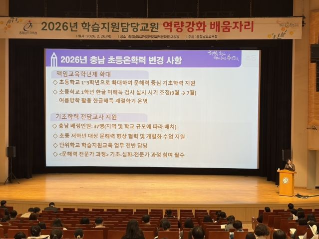 [ 중앙뉴스미디어 ] 충남교육청은 26일 충남교육청학생교육문화원(천안)에서 2026년 학습 지원 담당 교원 410명과 14개 시군 교육지원청 기초학력 담당 장학사를 대상으로 배움자리를 개최했다.