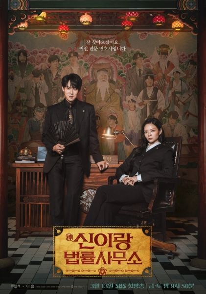 앞서 공개된 티저 포스터에서는 부적이 가득 붙은 벽면과 향로의 연기가 자욱한 옥천빌딩 501호의 ‘신이랑 법률사무소’가 “보이지 않는 진실을 변호합니다”라는 문구를 내세우며 기묘한 세계관의 시작을 알렸다. 그리고 이번 메인 포스터에서는 그 수상한 공간이 보다 선명하게 위용을 드러낸다. 고풍스러운 법률사무소 내부, 그 중심에 자리한 변호사 신이랑(유연석)과 한나현(이솜)의 뒷 배경에 전통 민화풍으로 그려진 신적 존재들과 망자가 차지하고 있는 것. 이곳이 단순한 로펌이 아닌, 보이지 않는 세계와 연결된 장소임을 직관적으로 보여주는 대목이다.