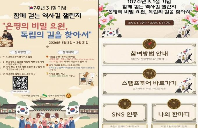 김미경 은평구청장은 “이번 챌린지는 구민과 방문객이 암호를 풀며 은평의 보훈 유적지를 직접 찾아가 그 의미를 되새길 수 있도록 마련한 프로그램”이라며 “역사적 현장에서 선열들의 숭고한 뜻을 가슴 깊이 새기며 역사의 도시 은평을 함께 누벼주시길 바란다”고 밝혔다.