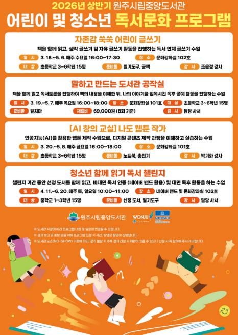 [ 중앙뉴스미디어 ] 원주시립중앙도서관은 오는 3월부터 6월까지 ‘2026년 상반기 어린이 및 청소년 독서문화 프로그램’을 운영한다.