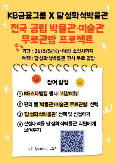 [ 중앙뉴스미디어 ] 대구 달성화석박물관이 문화체육관광부와 KB국민은행, 한국박물관협회가 공동 추진하는 ‘KB×전국 공립 박물관·미술관 무료 관람 프로젝트’에 최종 선정됐다. 문화 접근성 격차를 줄이고 국민의 문화 향유 기회를 확대하기 위해 마련된 공익사업으로, 달성화석박물관은 화석·자연사 분야의 전문성과 지역사회 기여도를 인정받아 지원 대상에 이름을 올렸다.