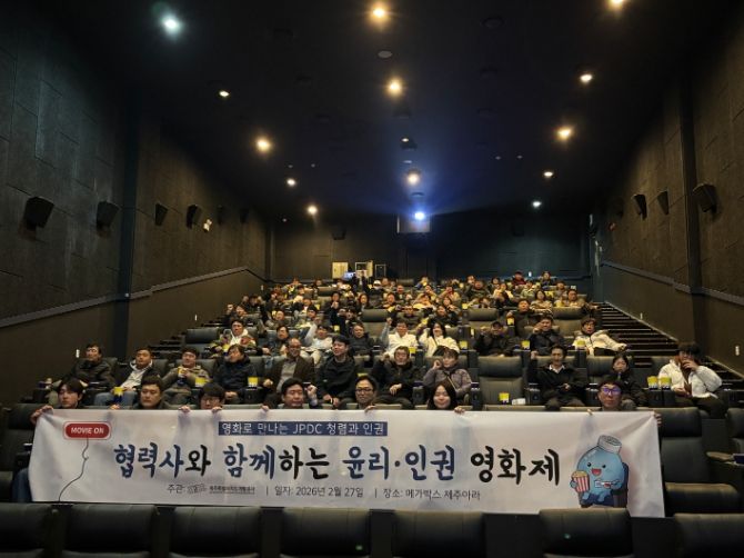 [ 중앙뉴스미디어 ] 제주삼다수를 생산·유통하는 제주특별자치도개발공사(사장 백경훈)는 지난 27일 메가박스 제주아라점에서 운송 협력사와 함께하는 ‘윤리·인권 영화제’를 개최했다.