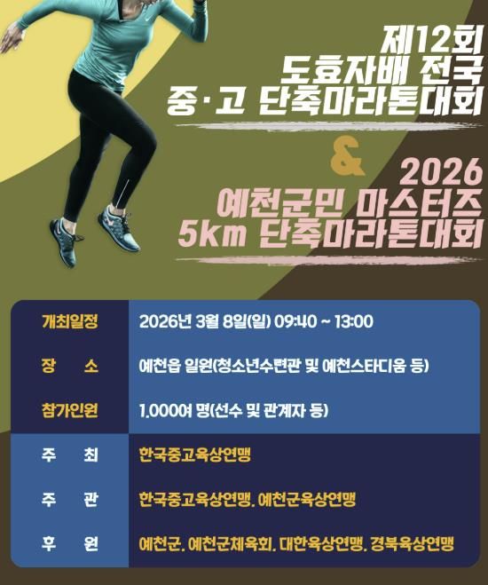 [ 중앙뉴스미디어 ] 예천군은 오는 8일 오전 10시부터 예천읍 일원에서 '제12회 예천 도효자배 전국 중·고 단축마라톤대회' 및 '2026 예천군민 마스터즈 단축마라톤대회'를 개최한다고 밝혔다.