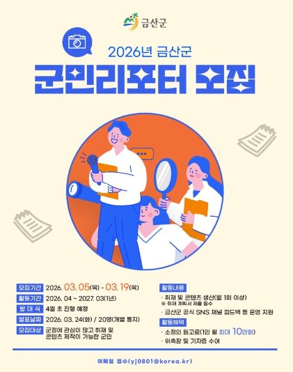 [ 중앙뉴스미디어 ] 금산군은 군민의 시선으로 지역의 다양한 이야기를 전할 2026년 군민리포터를 공개 모집한다.