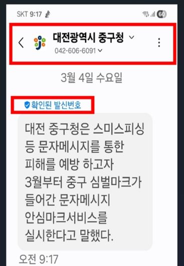 [ 중앙뉴스미디어 ] 대전 중구는 구청에서 발송하는 구정 안내 및 민원처리 관련 문자메시지의 신뢰도를 높이고 스미싱 피해를 예방하기 위해 ‘안심마크서비스(RCS)’를 본격 시행한다고 5일 밝혔다.