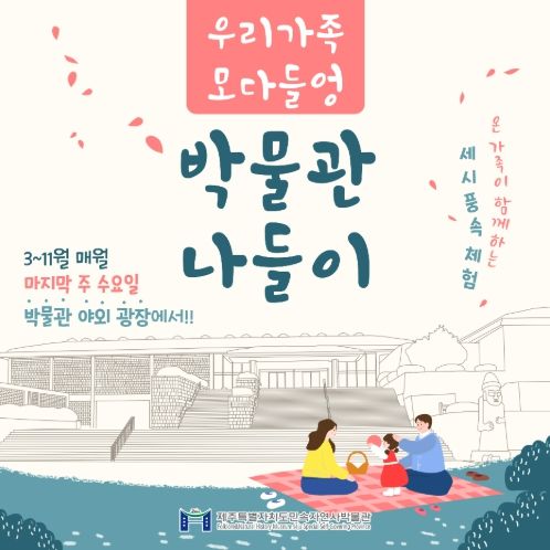 [ 중앙뉴스미디어 ] 제주민속자연사박물관이 오는 3월부터 11월까지 매월 마지막 주 수요일 ‘문화가 있는 날’을 맞아, 제주의 세시풍속을 테마로 한 체험 프로그램 ‘우리 가족 모다들엉 박물관 나들이’를 운영한다.