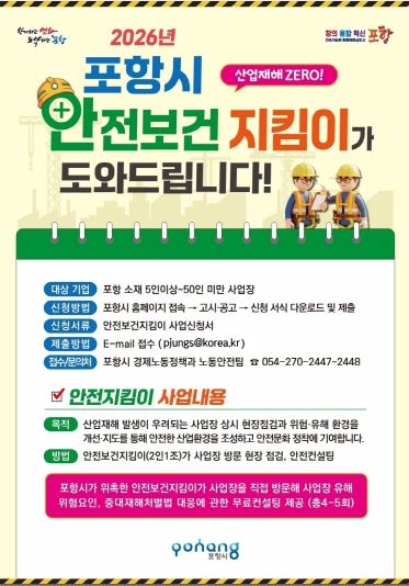 시는 ‘포항시 산업재해 예방 및 노동안전보건 지원 조례’에 근거해 2026년 안전보건지킴이 운영을 확대하고 있다. 향후 산업안전보건 우수기업 인증 및 환경개선 지원사업과도 연계해 예방 중심의 선순환 안전 정책을 지속 추진할 계획이다.