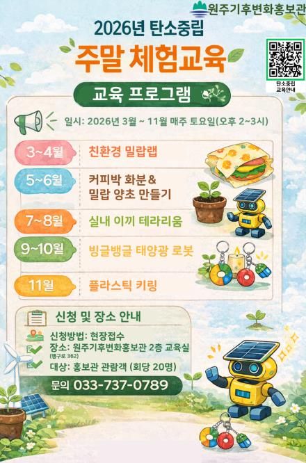 프로그램은 3월부터 11월까지 매주 토요일 오후 2시부터 3시까지 홍보관 2층 교육실에서 진행된다. 회당 선착순 20명까지 현장 접수를 통해 참여할 수 있다. 자세한 사항은 원주기후변화홍보관으로 문의하면 된다.