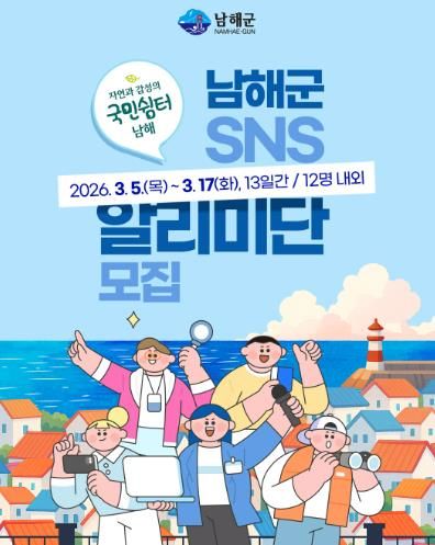 [ 중앙뉴스미디어 ] 남해군이 ‘2026년 자연과 감성의 국민쉼터’ 남해의 다채로운 매력을 널리 전파할 ‘제9기 남해군 SNS 알리미단’을 오는 3월 5일부터 17일까지 13일간 모집한다.