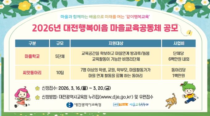 [ 중앙뉴스미디어 ] 대전시교육청은 마을과 학교가 협력하는 교육생태계 조성을 위해 ‘2026년 마을교육공동체 마을학교 및 씨앗동아리’를 공모한다고 밝혔다.