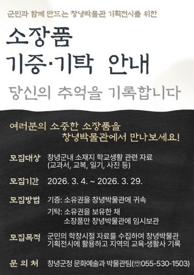 소장품 모집 기간은 3월 4일부터 3월 29일까지이며, 참여를 희망하는 군민은 기증 또는 기탁의 방식으로 창녕박물관에 접수하면 된다.