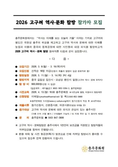 [ 중앙뉴스미디어 ] 충주문화원(원장 유진태)이 중국 길림성 집안시와 요녕성 환인시에 위치한 고구려 역사·문화 유적을 탐방할 답사자 18명을 선착순 모집한다.