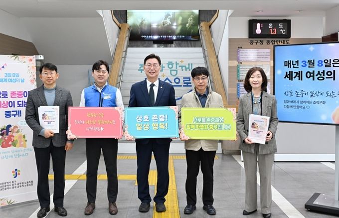 [ 중앙뉴스미디어 ] 대전 중구는 ‘3.8 세계 여성의 날’을 앞두고 지난 6일 구청 본관 로비에서 노사가 함께 출근하는 직원들을 격려하며 ‘좋은 직장, 서로 존중 캠페인’을 전개했다고 밝혔다.