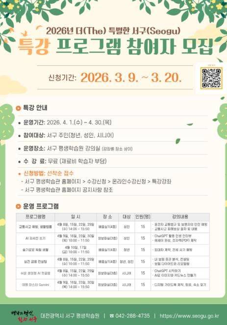 [ 중앙뉴스미디어 ] 대전 서구 평생학습원은 ‘2026년 봄학기 더(The) 특별한 서구(seogu)’특강 참여자를 모집한다고 9일 밝혔다.