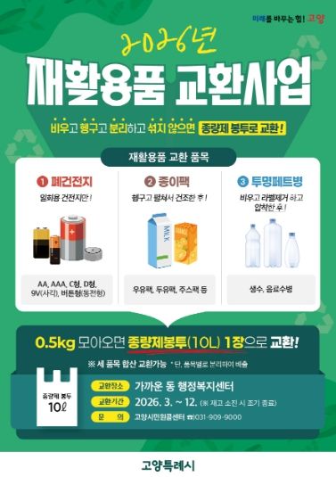 [ 중앙뉴스미디어 ] 고양특례시 덕양구 창릉동은 주민들의 자원 재활용 참여를 확대하고 올바른 분리배출 문화를 정착시키기 위해 ‘2026년 재활용품 교환사업’을 운영한다고 밝혔다.