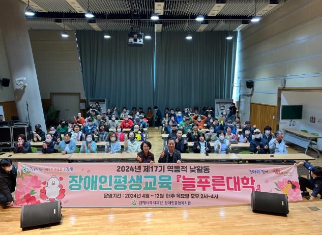 ‘장애인평생교육 제17기 늘푸른대학’은 김해시에 거주하는 등록 장애인 50명을 대상으로 사회참여가 어려운 장애인들을 위해 맞춤형 교육과 여가활동의 기회를 제공함으로써, 장애 당사자의 교육/여가에 대한 욕구충족과 일상생활 스트레스를 해소시켜 삶의 질을 향상코자 진행되는 장애인평생교육 프로그램이다.
