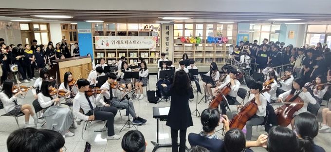 본교 음악교사 박혜리의 지휘 아래 31명의 오케스트라 단원이 학생들이 좋아하는‘바다가 보이는 마을(마녀배달부 키키 OST)’, ‘쇼스타코비치 왈츠 2번’, ‘어벤져스 OST’를 연주했으며, 등교하는 학생들이 2층 도서관 앞 로비와 각 교실에서 행복하고 즐겁게 하루를 시작하는 기회를 제공했다.