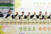 [ 중앙뉴스미디어 ] 영천시는 22일부터 28일까지 일주일간 대형 하나로마트 9개점에서 ‘설 명절맞이 영천포도 특판행사’를 진행한다고 밝혔다. 이번 행사는 설 명절을 맞아 영천포도를 홍보하기 위해 마련됐으며, 우수한 품질을 자랑하는 영천 샤인머스캣 1.5kg 상자 3만 박스(45톤)를 양재, 창동, 수원, 성남 등 대형 하나로마트 9개점에 공급한다. 특별 행사가 진행된 27일에는 최기문 시장, 김선태 시의장, 이상용 농협 영천시지부장, 성영근 영천농협조합장, 김천덕 금호농협조합장, 이상혁 고경농협조합장, 장호진 조합공동사업법인 대표 등이 하나로마트 양재점에 직접 방문해, 현장에서 판촉활동을 펼치며 소비자 홍보에 나섰다. 시 관계자는 “설 명절을 맞아 명품 영천 샤인머스캣을 공급하기 위해 당도가 높고 품질이 우수한 물량을 엄선해 준비했다”며, “설 명절, 가족들과 함께 달콤한 영천포도를 맛보며 즐기시길 바란다”고 말했다. 한편 영천시는 높은 당도와 뛰어난 맛을 가진 영천포도의 전국적인 판매와 홍보를 위해 하나로마트, 이마트, 롯데마트 등 대형 유통업체와 협업해 전국 대도시와 인근 소비지를 대상으로 행