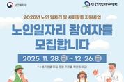 [ 중앙뉴스미디어 ] 의성군은 지역 어르신들의 건강한 노후생활과 안정적 소득 활동을 지원하기 위해 12월 9일부터 16일까지 '2026년 노인일자리사업'참여자 2,706명을 모집한다고 밝혔다. 노인일자리사업은 어르신들의 활기차고 건강한 노후를 지원하기 위한 대표적 노인복지 정책으로, 2026년에는 112억 원의 예산을 투입해 ▲공익활동 2,145명 ▲역량활용 331명 ▲공동체사업단 260명 등 총2,706명의 어르신이 일자리에 참여하여 총 31개 사업단을 운영할 계획이다. 참여자 모집은 노인일자리사업 위탁 수행기관인 의성시니어클럽과 대한노인회 의성군지회가 담당하며, 9일부터 16일까지 각 읍·면사무소 및 읍·면 분회경로당 순회 방문을 통해 신청 접수를 진행한다. 선발은 관련 기준에 따라 고득점자 순으로 이뤄질 예정이다. 김주수 의성군수는 “노인일자리사업은 어르신들의 신체적·정신적 건강 증진과 사회적 관계 형성, 경제적 도움 등 여러 측면에서 긍정적인 효과가 큰 사업”이라며 “앞으로도 어르신들의 사회적 역할과 활력을 높일 수 있도록 다양한 일자리 정책을 적극 추진하겠다”고 밝혔다. [뉴스출처 : 경상북도의성군
