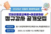 [ 중앙뉴스미디어 ] 포항시평생학습원은 2026년도 정규 강좌 운영을 위해 미래사회 변화에 대응할 역량을 갖춘 전문 강사 138명을 공개 모집한다고 2일 밝혔다. 모집 분야별 인원수는 뱃머리평생교육관 일반성인 강좌 58명과 시니어 강좌 30명 및 청소년 강좌 16명, 그리고 여성문화관 정규강좌 34명이다. 자격증·직업능력·문화예술·건강·정보화·외국어·스포츠 등 기존에 수요가 높은 과목뿐 아니라, 지난 11월에 발표된 교육부의 ‘AI for All’ 정책에 맞춰 생애주기별 AI 강좌를 신규 편성해 해당 강사를 모집한다. 또한 고령층을 위한 실버 분야 자격증 강좌를 여성문화관에 새로 개설해 변화하는 학습 수요와 사회적 요구를 반영할 계획이다. 강사 모집 일정은 다음과 같다. 서류 접수는 오는 16일부터 18일까지 방문 접수로 진행되며, 응시자격은 해당 분야의 전문지식과 강의 경험 보유자, 교원자격증 소지자, 관련 자격증 소지자 등이다. 서류합격자는 12월 24일 문자로 개별 통보되고, 최종 합격자는 12월 29일 평생학습원 홈페이지를 통해 발표된다. 자세한 내용