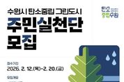 [ 중앙뉴스미디어 ] 수원특례시가 ‘생활 속 탄소중립 실천’을 확산하기 위해 2월 12일부터 20일까지 탄소중립 그린도시 사업 대상지 주민·생활권자를 대상으로 ‘수원시 탄소중립 그린도시 주민실천단’ 신규 참여자를 모집한다. 주민실천단은 탄소중립 그린도시 사업 대상지 주민과 생활권자로 구성된 시민 참여 조직이다. 지역 내 탄소중립 실천 활동과 홍보, 주민 참여 활동 등을 한다. 특히 수원시는 올해 주민실천단을 70명 규모로 확대 운영할 계획이다. 지난해 운영 성과를 바탕으로 신규 참여자를 모집해 참여 기반을 넓히고, 일회성 캠페인을 넘어 생활 속 실천이 자연스럽게 이어지는 탄소중립 문화를 확산할 계획이다. 모집 대상은 고색동·오목천동·탑동·서둔동·호매실동·평동·평리동 일부 등 탄소중립 그린도시 사업 대상지 거주민과 해당 지역 생활권자다. 주민실천단은 자원봉사 형태로 활동하며 ▲생활 속 탄소 저감 실천 ▲지역 맞춤형 실천 활동 ▲탄소중립 실천 홍보 ▲분과 활동, 회의 ▲역량 강화 교육 등에 참여한다. 수원시는 탄소중립 그린도시 주민실천단 확대 운영에 맞춰 참여자 역량을 높이는 교육과 분과별