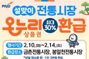 [ 중앙뉴스미디어 ] 파주시는 2026년 설 명절을 맞아 고물가로 인한 시민들의 가계 부담을 덜고 지역 전통시장 활성화를 도모하기 위해 ‘설맞이 농축산물 온누리상품권 환급 행사’를 실시한다. 이번 행사는 농림축산식품부가 주관하는 ‘농축산물 할인지원’사업의 일환으로, 본격적인 제수용품 구매 기간인ق월 10일부터 14일까지 5일간 관내 전통시장 2곳(봉일천전통시장, 금촌전통시장)에서 진행된다. 행사 기간 동안 참여 점포에서 국산 농축산물을 구매한 고객은 구매 금액에 따라 1만 원 또는 2만 원 상당의 온누리상품권을 환급받을 수 있다. 환급 기준은 ▲구매 금액이 3만 4천원 이상 6만 7천 원 미만일 경우 1만 원 ▲6만 7천 원 이상일 경우 2만 원이며, 환급 한도는 1인당 최대 2만 원이다. 단, 예산 소진 시 행사는 조기 종료될 수 있다. 환급을 희망하는 고객은 당일 구매 영수증과 신분증을 지참해 각 시장 내에 마련된 지정 환급처를 방문하면 된다. 환급 대상 품목은 국산 농산물 및 축산물이며, 수입산 농축산물이나 법인카드 결제 내역, 제로페이 모바일 상품권 결제 내역 등은 환급 대상에서 제외된다.