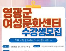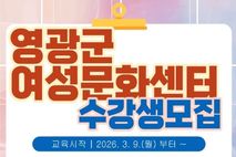 [ 중앙뉴스미디어 ] 영광군 여성문화센터는 '2026년 상반기 여성문화센터 프로그램' 수강생을 모집한다고 밝혔다. 이번 상반기 프로그램은 최근 완료된 여성문화센터 리모델링 이후 처음 운영되는 과정으로, 한층 더 쾌적해진 교육환경 속에서 다양한 배움의 기회를 제공할 예정이다. 센터 프로그램실 전반을 새롭게 정비해 밝고 쾌적한 학습공간을 조성했으며, 수강생들이 편안하게 머물 수 있도록 휴식공간도 새롭게 마련했다. 2026년 상반기 프로그램은 여성의 자기개발과 역량 강화를 목표로 생활문화·건강·인문교양·직업능력 분야 등 총 15개 강좌를 구성했다. 주요 강좌로는 ▲한식조리사 ▲화훼장식기능사 ▲펫시터(반려견) 양성과정 ▲파크골프지도사2급 취업·창업 프로그램과 △드럼 △AI광고만들기 △바둑교실 △홈미싱(기초반) △도쿄의 식탁(일본요리) △태교요가 △스텝박스·바레다이어트 △런닝클래스 △셔플댄스 △수박카빙완전정복 △슬립업체형교정요가 취미·교양강좌를 개설했다. 수강 신청은 2026년 2월 23일부터 3월 6일까지 영광군에 주소를 두고 거주하는 여성이면 누구나 신청이 가능하고, 여성문화센터 직접 방문