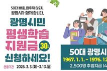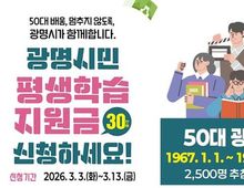 [ 중앙뉴스미디어 ] 광명시가 50대 중장년 시민의 배움 기본권 보장을 위해 올해도 평생학습지원금 지원을 이어간다. 시는 오는 3월 3일부터 13일까지 11일간 ‘2026년 광명시민 평생학습지원금’ 신청을 받는다고 26일 밝혔다. 광명시민 평생학습지원금은 생애 전환기를 맞은 50대 시민이 나이·소득·배경과 관계없이 배움을 지속할 수 있도록 생애 1회 1인당 30만 원의 평생학습이용포인트를 지원하는 사업이다. 시민 스스로 자신의 삶과 필요에 맞는 학습을 선택하도록 돕는 것이 핵심 목적이다. 박승원 광명시장은 “배움은 선택이 아닌 누구에게나 보장돼야 할 기본권”이라며 “시민이 나이나 환경의 제약 없이 언제든지 배움을 이어갈 수 있도록 평생학습 기반을 더욱 탄탄히 만들어가겠다”고 밝혔다. 신청 대상은 1967년 1월 1일부터 1976년 12월 31일 사이에 출생한 50대 광명시민이다. 광명시에 1년 이상 계속 거주했거나, 거주기간을 합산해 5년 이상 거주하고 있어야 한다. 시는 총 2천500명을 선정해 지원한다. 59세(1967년생)는 올해가 마지막 지원 대상임을 고려해 우선 선정하고, 19