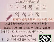 [ 중앙뉴스미디어 ] 군포시산본도서관은 2026년에도 관내 시니어들에게 책을 통해 서로 소통하고 공감하는 능동적 독서교육 프로그램인 ‘시니어 북클럽 양성 과정’을 운영한다고 밝혔다. 이번 교육은 2월 4일부터 4월 15일까지 매주 수요일 오전 10시부터 12시까지 총 10주차로 진행되며 북클럽 운영을 위한 운영법, 글쓰기 방법, 주제도서의 낭독과 필사 등에 대해 교육하여 시니어 독서동아리로 자발적인 활동을 할 수 있도록 실전교육 위주로 진행된다. 산본도서관에서 2025년도에 ‘낭독과 필사로 떠나는 글쓰기 여행’ 수업을 맡았던 최선화 강사가 진행하며 도서관은 교육 기간 중, 신규 시니어 독서동아리를 모집 및 결성하여 지속적인 독서 모임 활동을 지원할 계획이다. 함께 글쓰기 및 독서에 관심있는 관내 55세 이상 시니어라면 누구나 신청 가능하며, 1월 19일부터 선착순으로 20명을 모집한다. 신청은 군포시도서관누리집 문화행사신청 또는 전화 접수가 가능하다. 하은호 군포시장은 “앞으로 산본도서관이 시니어 세대가 책으로 하나 되는 소통공간이 될 수 있도록 다양한 독서교육 프로그램을 운영하겠다”라며 “독서교육