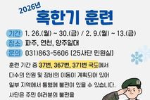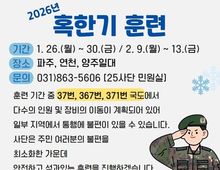 [ 중앙뉴스미디어 ] 육군 제25보병사단이 2026년 1월 26일부터 30일까지 파주시ㆍ양주시 일대에서, 2026년 2월 9일부터 13일까지 파주시ㆍ양주시ㆍ연천군 일대에서 각 1주간 혹한기 훈련을 실시한다. 이번 훈련은 안전이 확보된 가운데 실제 훈련을 통한 동계 작전계획 시행능력을 구비하고, 전·평시 작전수행능력 숙달 및 군사대비태세를 완비하는 데 중점을 두고 진행된다. 부대 관계자는 훈련 기간 중 37번·367번·371번 국도에서 다수의 병력과 장비, 차량이 이동하게 되며 훈련 상황에 따라 부분적인 교통통제 등이 실시되어 주민들의 이해와 적극적인 협조를 당부했다. 사단은 훈련기간 중 주민불편을 최소화하고, 부대 안전사고를 예방하기 위해 안전통제반을 운영할 계획이다.