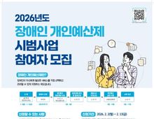 [ 중앙뉴스미디어 ] 담양군이 보건복지부의 ‘2026년도 장애인 개인예산제 시범사업’ 수행 지자체로 선정됐다고 9일 밝혔다. 장애인 개인예산제는 획일적인 공급자 중심의 서비스에서 벗어나, 장애인 당사자가 본인의 욕구와 상황에 맞는 예산 이용계획을 수립해 자율적으로 활용할 수 있도록 하는 제도다. 참여자는 장애인 이용권(바우처) 서비스 급여 총액의 20% 내에서 필요한 물품을 구매하거나, 기존에 지원되지 않던 서비스를 직접 선택해 이용할 수 있다. 사업 참여를 희망하는 장애인은 오는 2월 13일까지 주소지 읍·면 사무소를 통해 신청하면 된다. 군 관계자는 “이번 시범사업을 통해 장애인의 자기 결정권이 한층 강화될 것으로 기대한다”라며, “앞으로도 장애인이 일상에서 체감할 수 있는 맞춤형 복지체계를 구축하는 데 최선을 다하겠다”라고 말했다. [뉴스출처 : 전라남도 담양군]