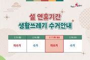 [ 중앙뉴스미디어 ] 성주군은 설 명절을 맞아 귀성객과 주민들이 쾌적한 환경 속에서 명절을 보낼 수 있도록 2월 2일부터 2월 20일까지 '설 연휴 쓰레기 종합관리대책'을 추진한다. 군은 연휴 기간 귀성객과 군민의 생활 불편을 최소화하기 위해 연휴를 전·중·후로 구분한 대응체계를 마련한다. 연휴 전에는 주요거리 등의 쓰레기 중점 수거와 환경정비를 실시하고 음식물쓰레기 증가에 대비한 비상 수거용기를 비치한다. 연휴 중에는 특별상황반을 운영해 생활폐기물 처리와 민원에 대응하며, 읍·면의 상황반과 비상연락체계를 유지한다. 연휴 이후에는 마무리 대청소와 노면청소차 운영을 통해 깨끗한 환경 조성에 힘쓸 계획이다. 특히 명절 선물 포장 등으로 스티로폼 상자와 종이박스 배출이 증가할 것으로 예상됨에 따라, 관내 유통업소에서 판매되는 설 선물류의 과대포장 및 재포장 행위에 대해서도 점검을 실시한다. 또한 주민들에게 배출장소 내 무분별한 투기를 예방하기 위한 지도·단속과 함께 재활용품 올바른 분리배출 방법에 대한 홍보를 강화할 예정이다. 자원순환사업소 관계자는 “설 명절 기간 생활폐기물 발생량이 급증할 것으로 예상된다”며 “원