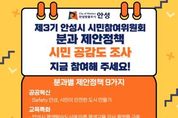 [ 중앙뉴스미디어 ] 안성시는 오는 18일 오후 6시까지 시민참여위원회 분과별 제안 정책에 대한 시민 의견을 수렴한다고 밝혔다. 이번 시민 의견 수렴은 시민참여위원회 정책 발표회를 앞두고 진행하는 사전심사로, 분과별 제안 정책에 대한 시민 공감도를 확인하여 추후 현장심사 결과와 함께 최종 우수 제안 정책을 선정하는 데 활용된다. 7개 분과로 구성된 안성시 시민참여위원회는 소속 위원의 다양한 경험과 지속적인 논의를 바탕으로 안성시 시정에 반영할 정책 연구 활동을 추진해 왔으며, 이달 정책 발표회를 통해 각 분과에서 도출한 정책을 제안하여 그간 활동의 결실을 맺을 예정이다. 정책 발표회를 통해 각 분과에서 제안할 정책 주제는 ▲Safety 안성, 시민이 안전한 도시 만들기(공공혁신분과) ▲안성시 평생학습도시에 따른 평생교육 강사 플랫폼 구축(교육특화분과) ▲안성시 한우산업 탄소중립 모니터링 시스템 구축(미래농업분과) ▲안성시민을 위한 태양광발전 5개년 계획(생태도시분과) ▲전통문화 예술인들을 위한 창작공간 확보(문화도시분과) ▲안성, 사랑 흔들바위 관광지 조성(문화도시분과) ▲더불어 이동하는 자유로운 안성(생활복지