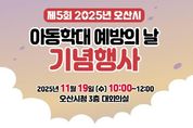 [ 중앙뉴스미디어 ] 오산시는 오는 19일 ‘아동학대예방의 날’과 ‘아동학대예방주간’을 맞아 기념행사 및 온·오프라인 캠페인을 실시한다고 12일 밝혔다. 행사는 19일 오전 10시부터 12시까지 오산시청 대회의실에서 진행되며, ▲1부 아동학대예방의 날 기념식 식전공연, 유공자 표창 시상, 퍼포먼스, ▲2부 부모교육 특별강연으로 구성된다. 특별강연은 리플러스 인간연구소 박재연 소장이 ‘부모를 위한 건강한 대화방법’을 주제로 진행한다. 매년 11월 19일은 아동학대 예방과 방지에 대한 사회적 관심을 높이기 위해 제정된 법정기념일로, 오산시는 매년 기념식과 강연, 캠페인 등을 통해 아동학대 예방의 중요성을 알리는 다양한 활동을 추진해오고 있다. 시는 이달 25일까지 온라인 릴레이 캠페인도 함께 진행한다. 오산시민 누구나 SNS에 아동학대예방 메시지 또는 관련 사진을 업로드해 참여할 수 있다. 또한 11월 24일에는 시청 인근 주요 교차로에서 시민 대상 오프라인 홍보 캠페인을 실시해 아동학대 예방 인식 제고에 나설 예정이다. 박현주 아동복지과장은 “이번 행사가 아동학대 예방의 중요성을 되새기고 아이들에게