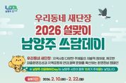 [ 중앙뉴스미디어 ] 남양주시는 10일부터 22일까지 시 전역에서 ‘설맞이 우리동네 새단장 남양주 쓰담데이 집중 추진기간’을 운영한다고 밝혔다. 이번 집중 추진은 설 명절을 앞두고 생활권 주변 환경을 정비하고 시민이 일상 속에서 실천하는 환경정화 활동을 확산하기 위해 마련됐다. ‘남양주 쓰담데이’는 시가 운영하는 대표적인 시민참여형 환경정화 프로그램이다. 특히 이번 쓰담데이는 행정안전부가 추진하는 전국 단위 환경정화 캠페인 ‘우리동네 새단장’과 연계해 추진한다. 지역별·단체별 자율 참여를 통해 공동체 중심의 환경 개선 활동을 확산하는 데 의미를 둔다. 2026년 현재 쓰담데이에는 약 5,200명과 277개 단체가 참여한다. △환경보호단체 △지역사회단체 △우리아파트봉사단 △상인회 등 다양한 주체가 정기적인 활동을 이어가고 있다. 시는 이번 집중 추진기간을 통해 명절 전 도시 환경을 정비하고, 시민 주도의 환경보전 실천 분위기를 확산시킬 방침이다. 이후에도 시민 중심의 자율적인 마을 단위 쓰담데이를 위한 행정적 지원을 지속할 계획이다. 쓰담데이 참여를 희망하는 시민은 남양주시 자원봉사센터